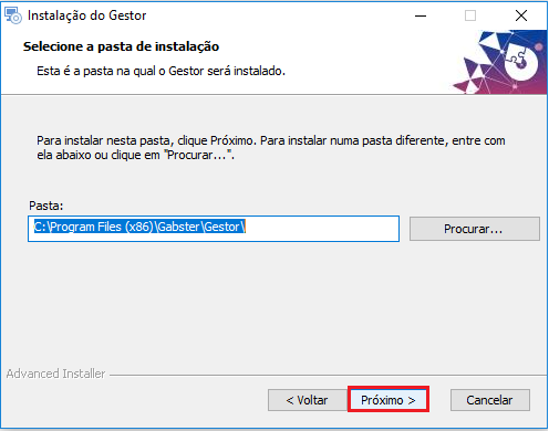 11. O instalador vai indicar o endereço padrão da pasta onde serão salvos os arquivos do Gestor. Não altere esse endereço e clique em "Próximo".