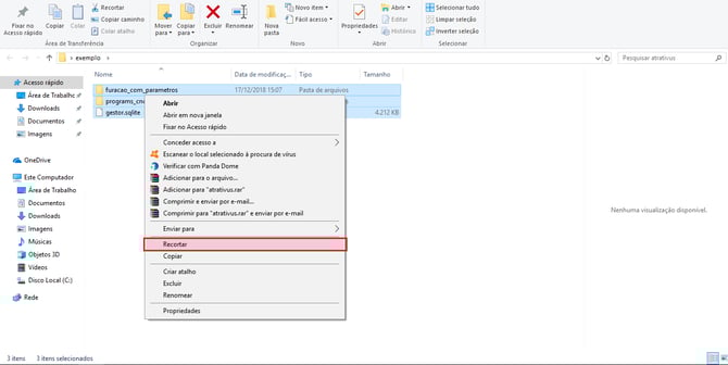 21. Após extrair os arquivos, basta acessar a pasta gerada com os arquivos extraídos anteriormente. Feito isto, basta selecionar todos os arquivos contidos nas pasta e com o botão direito clique em “Recortar”.